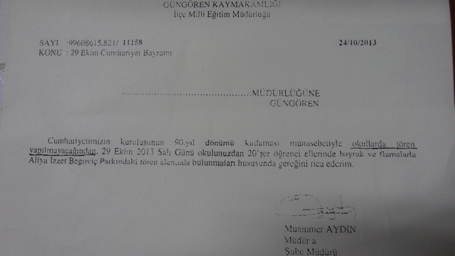 Güngören İlçe Milli Eğitim Müdürü Adına Şube Müdürü Muammer Aydın tarafından okullara gönderilen 24.12.2013 tarihli yazıda ‘’Cumhuriyetimizin kuruluşunun 90. yıldönümü kutlaması münasebetiyle okullarda tören yapılmayacağından’’ ibaresiyle, önümüzdeki Cumhuriyet Bayramının okullarda kutlanmayacağı anlaşılmaktadır. AKP iktidarı ve bürokratlarının milli bayramlarımıza yönelik yasakçı zihniyetinin bir ürünü olarak ortaya çıkan bu uygulama, MEB İlköğretim ve Ortaöğretim Kurumları Sosyal Etkinlikler Yönetmeliği 7.Bölümde yer alan maddelere açıkça aykırıdır. İlgili Maddeler: